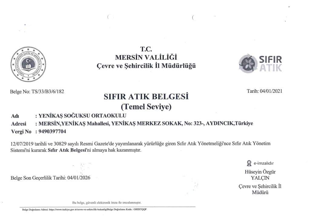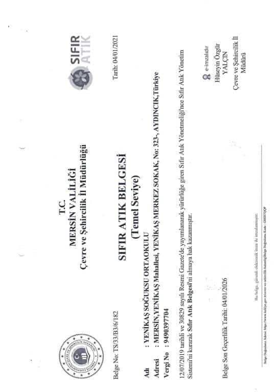 Okulumuz Sıfır Atık Projesi çerçevesinde T.C. Mersin Valiliği Çevre ve Şehircilik İl Müdürlüğü tarafından belge almış olup okul personelleri ve öğrencileri sıfır atık ilkesine hassasiyetle riayet etmektedir.